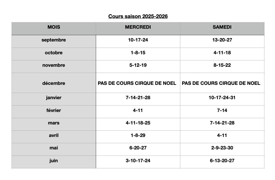 Nous proposons des cours pour la pratique des arts du cirque, avec du matériel et un encadrement professionnel pour évoluer en toute sécurité. À tout âge, chacun peut y développer des compétences, se dépasser et vaincre des peurs telles que la sensation de vertige par exemple. De nombreux ateliers sont encadrés, tels que : trapèze, cerceau aérien, tissu, équilibres (sur boule, rolla bolla, fil de fer…), jonglerie (balles, massues, diabolos…).